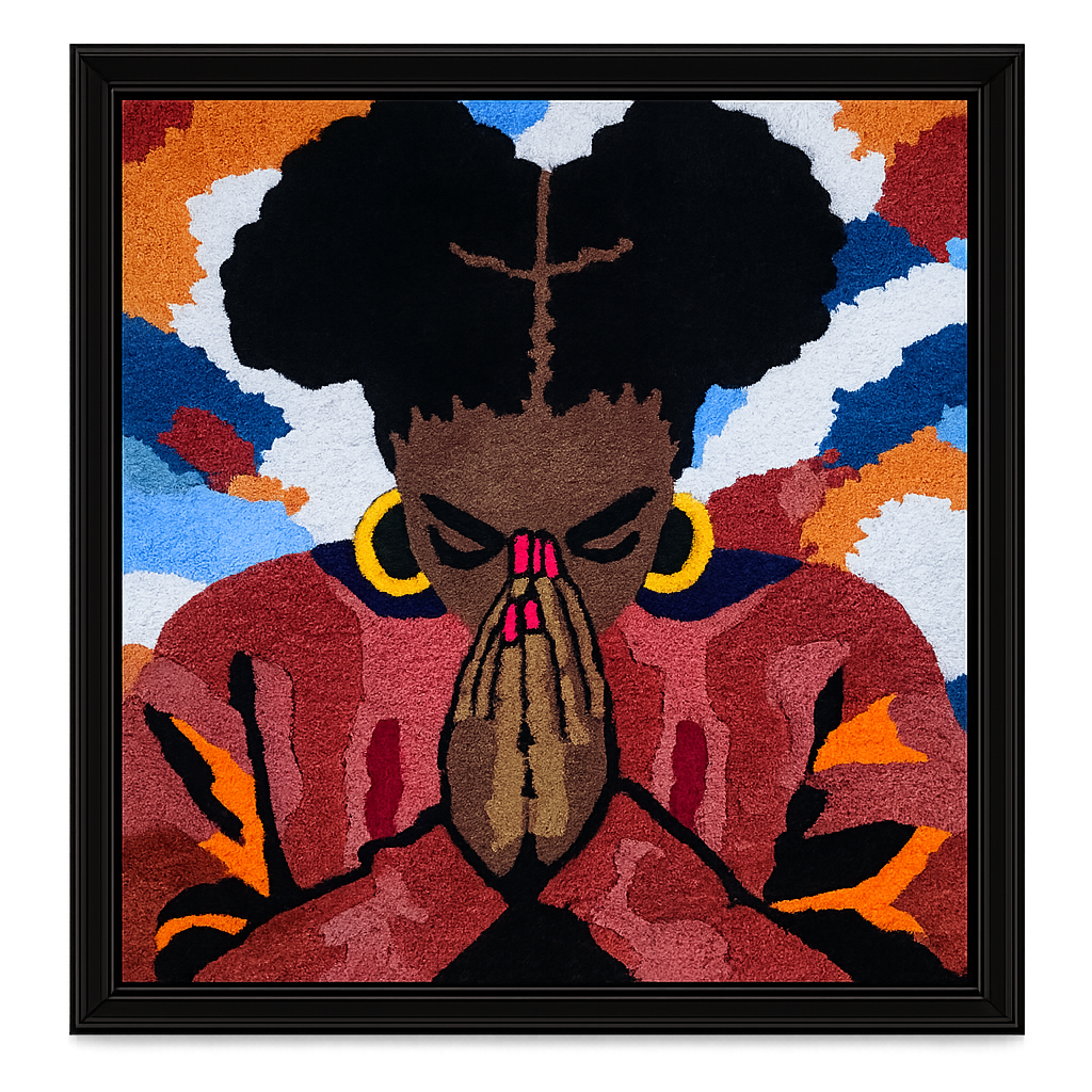 Marie Martine creates bold hand-tufted textile art using acrylic yarn, a tufting gun, and carving tools to shape each piece by hand. Inspired by music, people, and everyday moments. Her work blends color, culture, and emotion into textured portraits that celebrate individuality and rhythm. Each piece is mounted on a handmade, hand-painted frame and produced as a one-of-one work.
