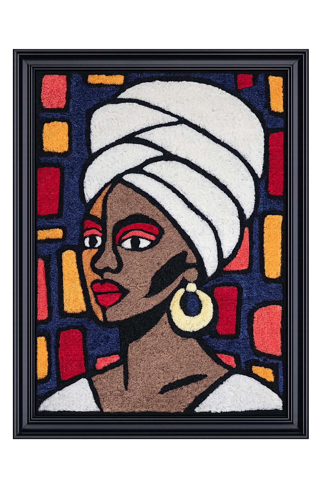 The Story: Inspired by stained glass, this hand-tufted portrait uses bold color panels to frame the figure like illuminated panes. The composition transforms traditional stained glass geometry into contemporary fiber art, where texture replaces light and sculpted yarn brings the portrait to life.